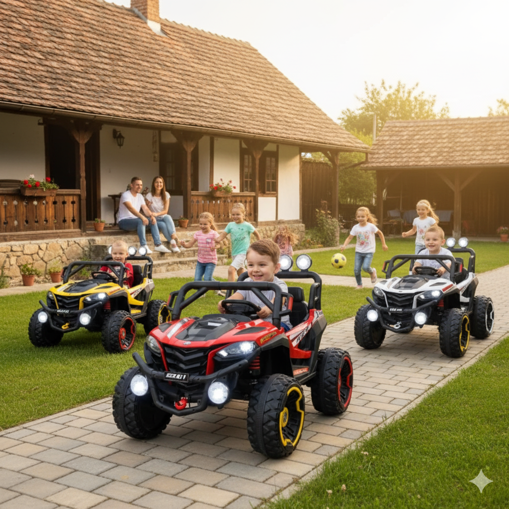 Veliki točkovi sa zaštitnom oblogom omogućavaju vožnju po neravnim terenima, dok amortizeri na svakom točku obezbeđuju stabilnost i udobnost. Deca mogu samostalno upravljati pedalama, dok roditelji uvek imaju mogućnost da preuzmu kontrolu putem daljinskog upravljača.