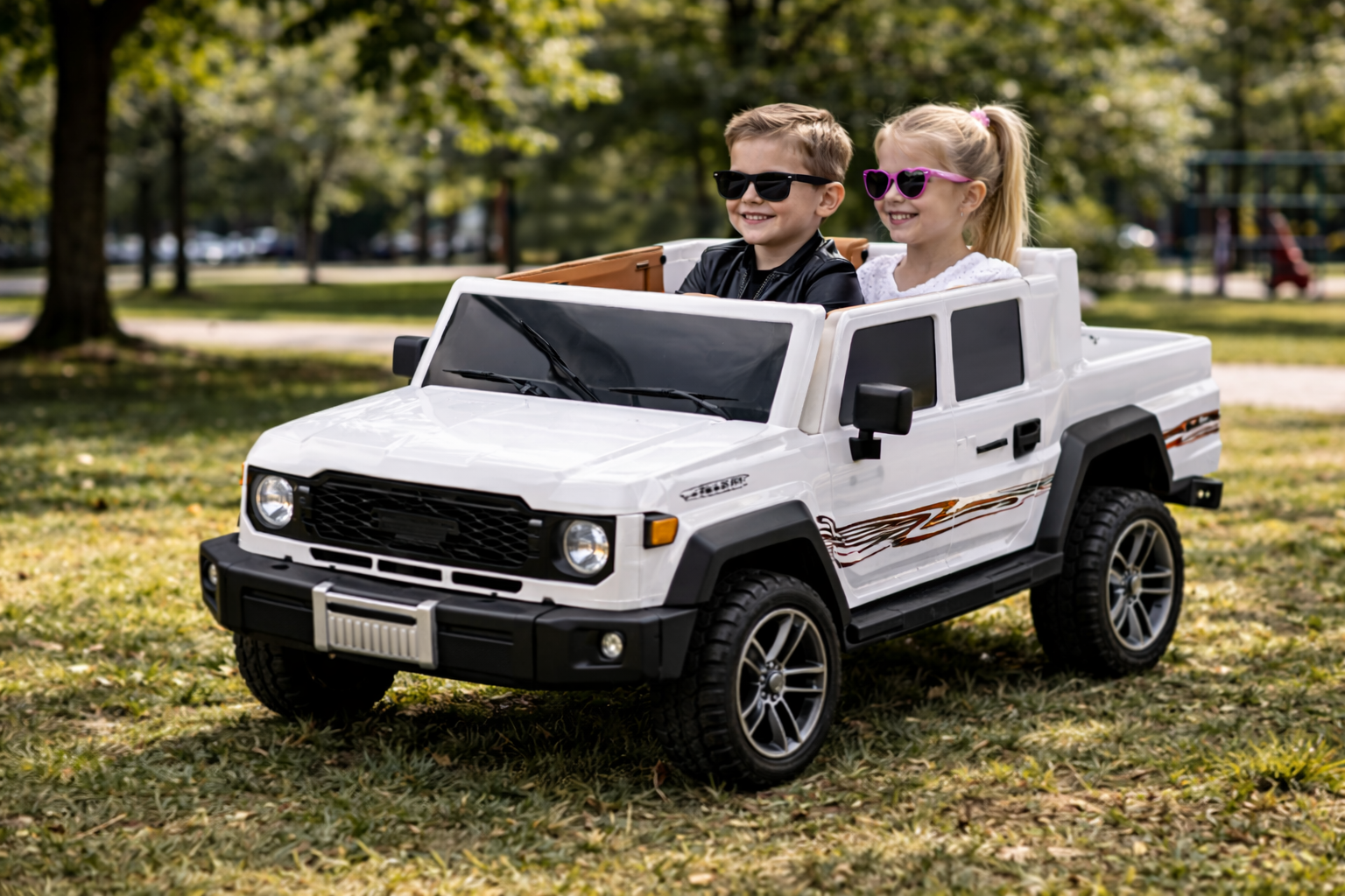 Opremljen snažnim motorima i baterijom velikog kapaciteta, džip omogućava dugotrajnu i pouzdanu vožnju. Dva sedišta sa sigurnosnim pojasevima omogućavaju istovremenu vožnju dvoje dece, čineći igru još zabavnijom. Multimedijalni panel sa Bluetooth, USB i MP3 funkcijama dodatno unapređuje iskustvo vožnje.