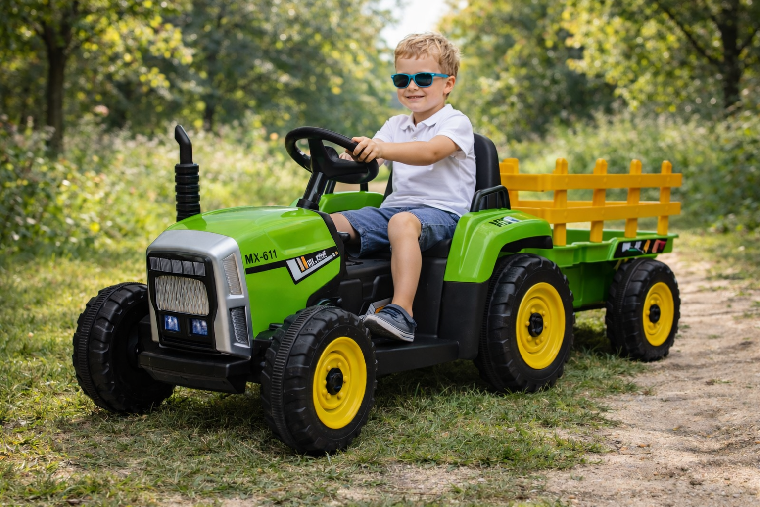 Velika i lako uklonjiva prikolica dodatno proširuje mogućnosti igre, omogućavajući prevoz igračaka, cveća ili drugih predmeta. Ugrađeni audio sistem sa MP3, USB i SD opcijama omogućava uživanje u muzici tokom vožnje, dok LED svetla doprinose realističnom izgledu.