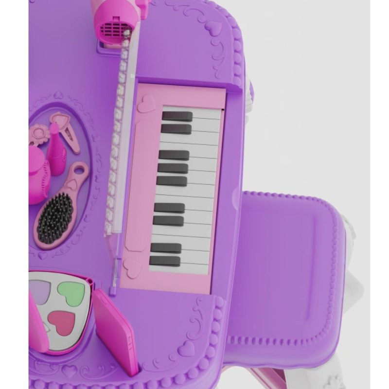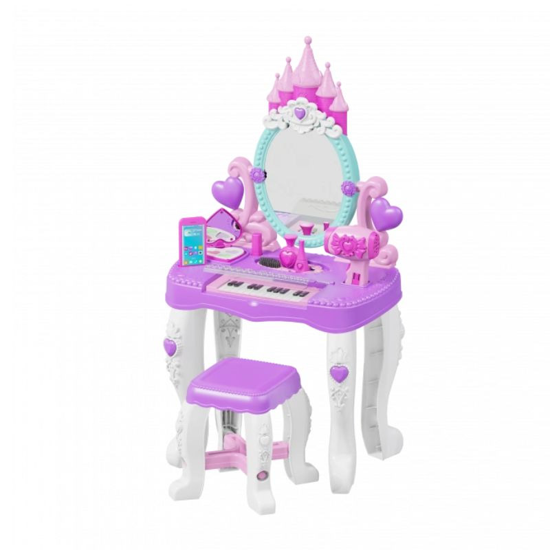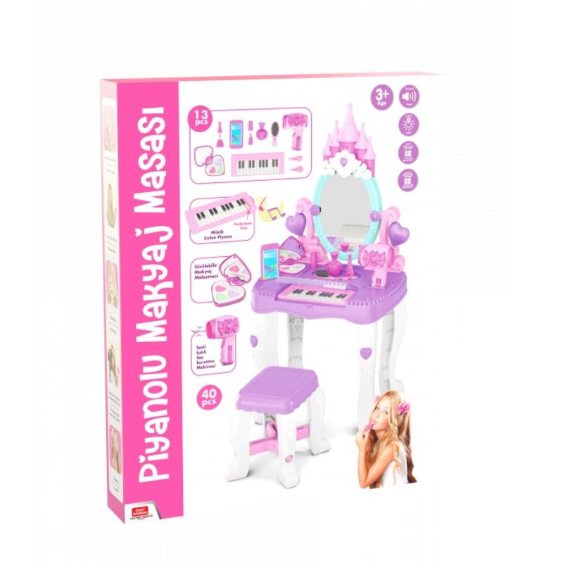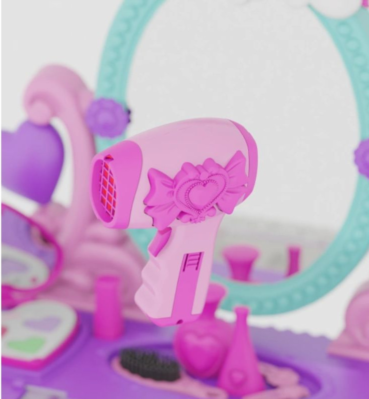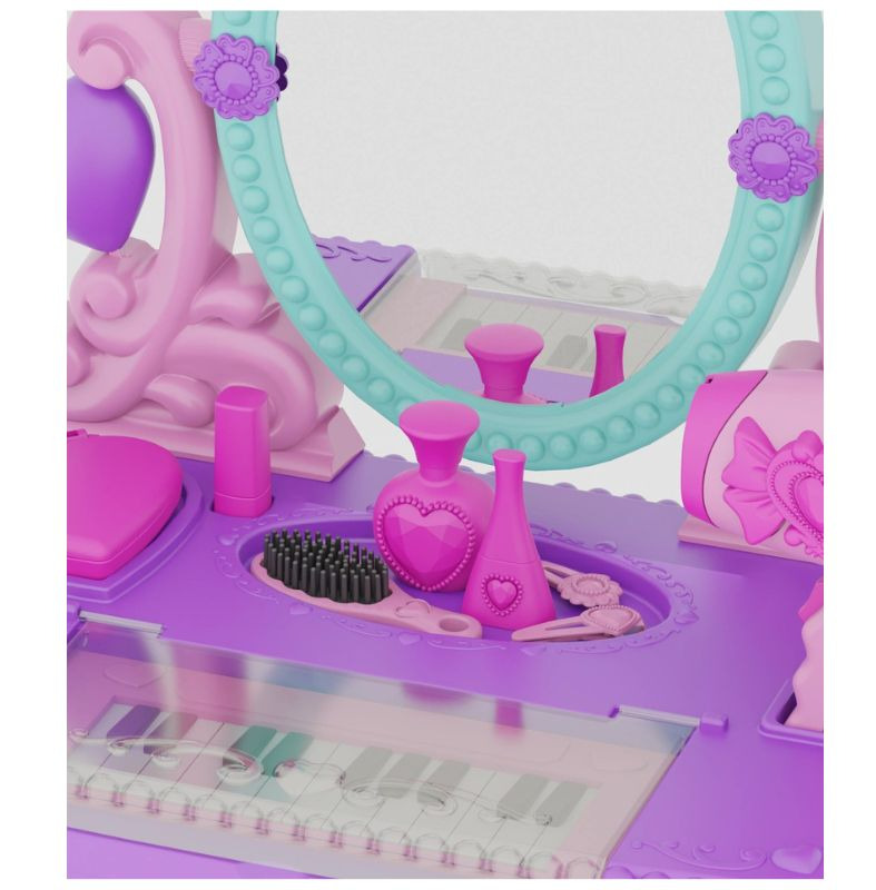 Set je opremljen ogledalom koje se može podešavati po visini, kao i elektronskim klavirom koji dodatno obogaćuje igru. Fen za kosu sa svetlosnim i zvučnim efektima pruža realističan doživljaj, dok set šminke izrađen od bezbednih sastojaka omogućava sigurnu igru.