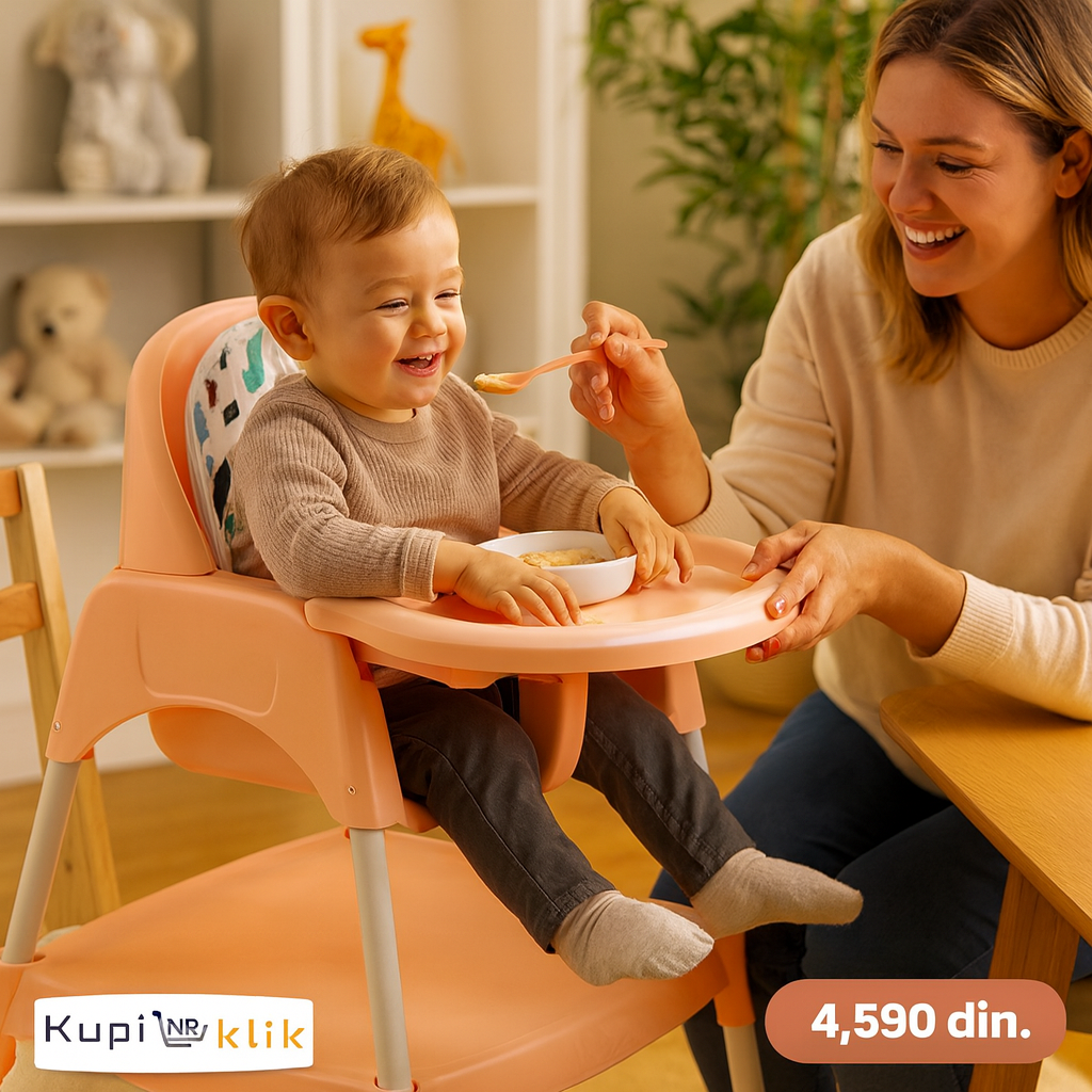 Stolica za hranjenje 2u1 breskva 614 dizajnirana je tako da kombinuje funkcionalnost hranilice sa praktičnošću dečijeg seta stočić + stolica. Jednostavnom transformacijom, iz hranilice prelazi u kompletan nameštaj za igru, crtanje ili užinu – što je čini odličnim rešenjem za dugoročnu upotrebu.