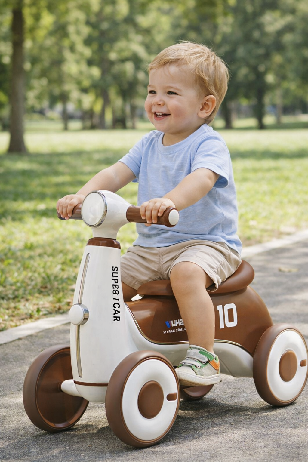 Stabilna i lagana dečija guralica model 476 u braon boji, idealna za uzrast 2+ godine. Razvija motoriku i pruža sigurnu i zabavnu vožnju.
