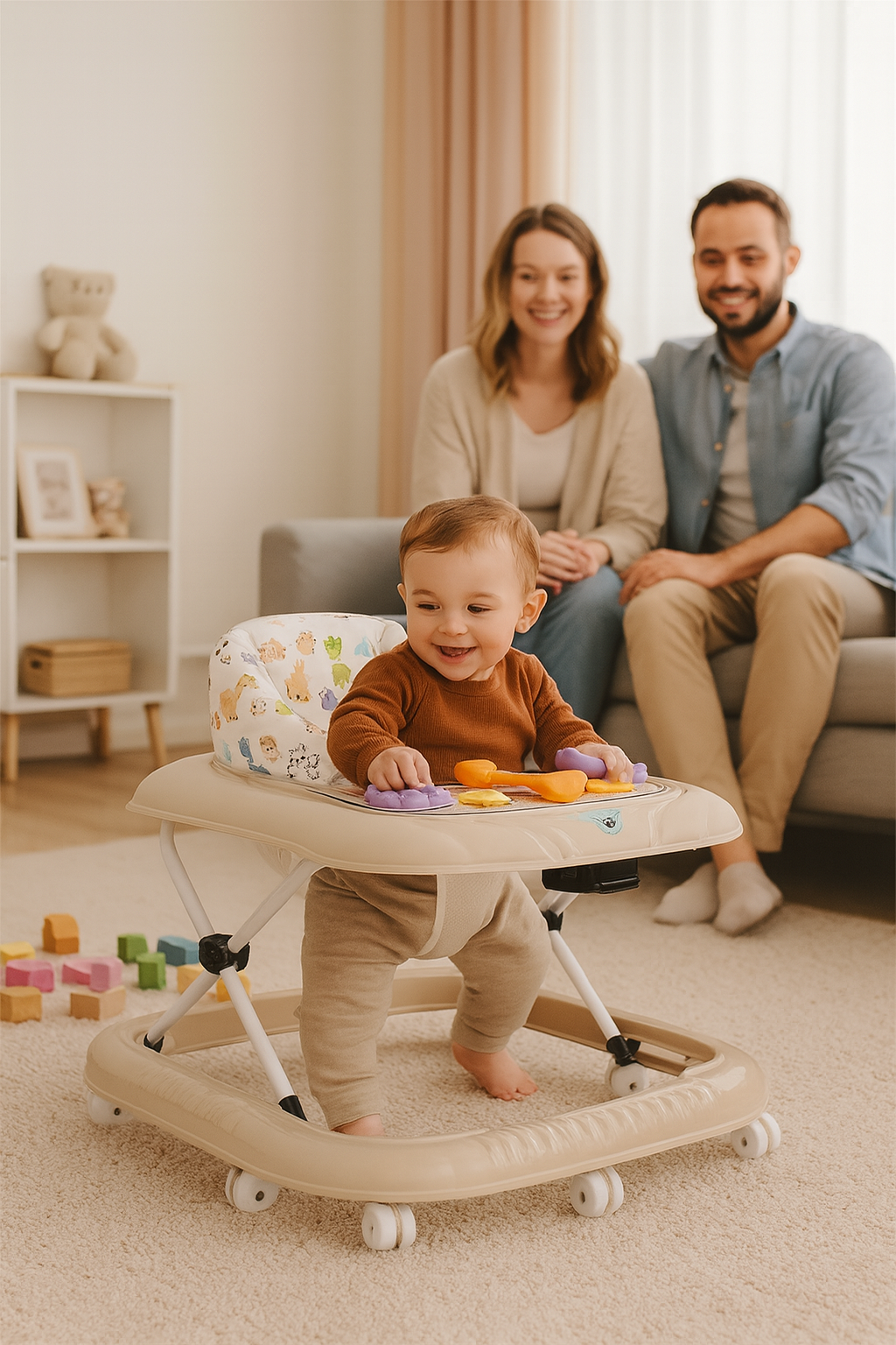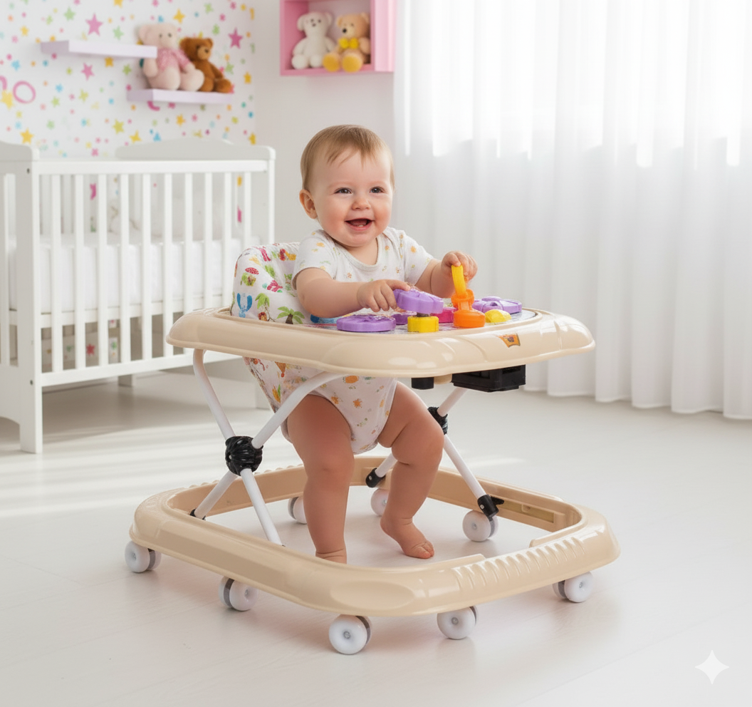 Podesiva visina u 3 nivoa čini ga prilagodljivim bebinom rastu, dok je mekano sedište sa potporom za leđa savršeno za udobno sedenje tokom igre i kretanja. Interaktivna tabla sa igračkama i oblicima podstiče razvoj motorike, koordinacije i radoznalosti.