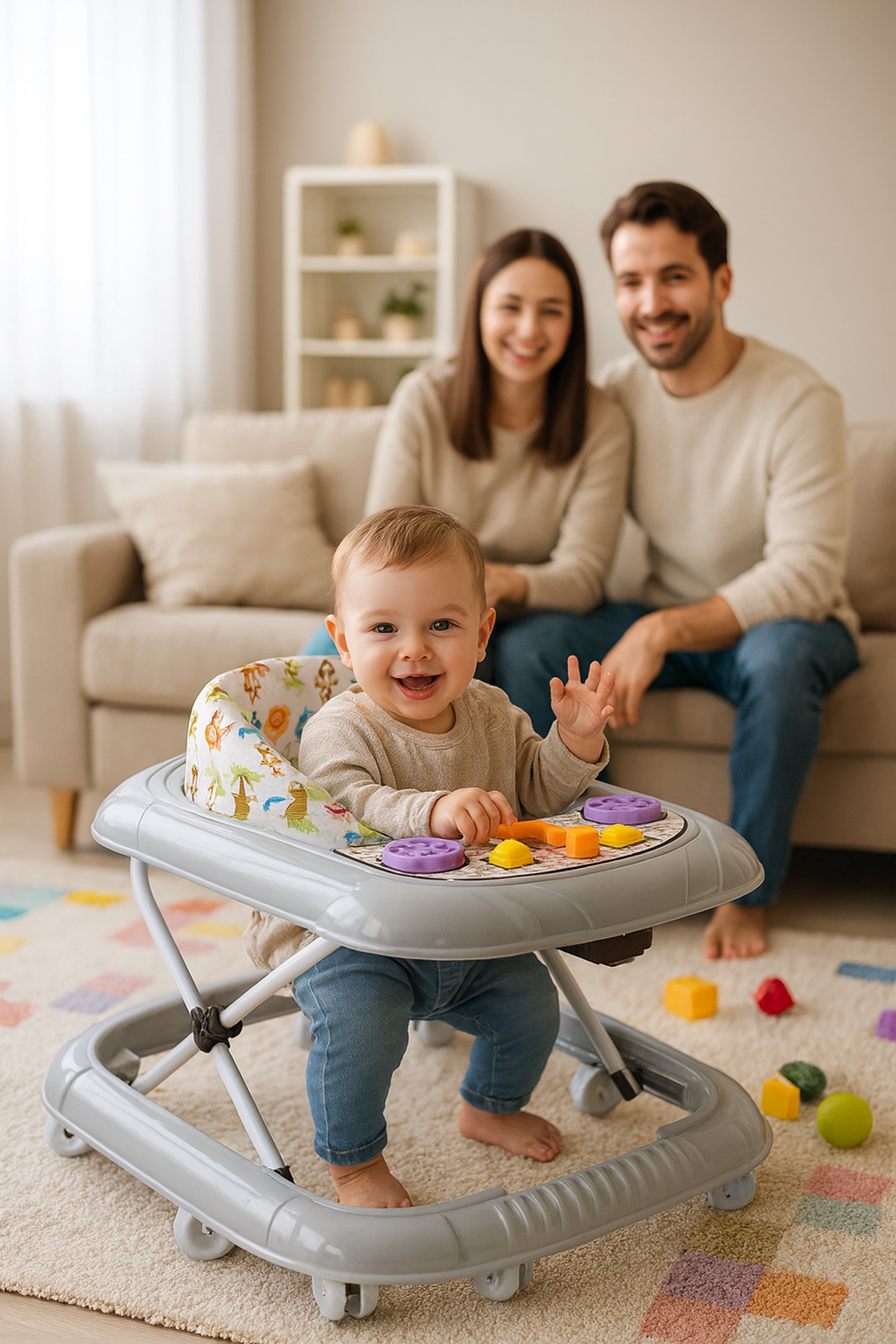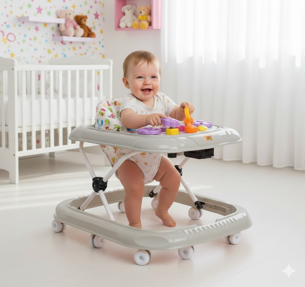 Podesiva visina u 3 nivoa čini ga prilagodljivim bebinom rastu, dok je mekano sedište sa potporom za leđa savršeno za udobno sedenje tokom igre i kretanja. Interaktivna tabla sa igračkama i oblicima podstiče razvoj motorike, koordinacije i radoznalosti.