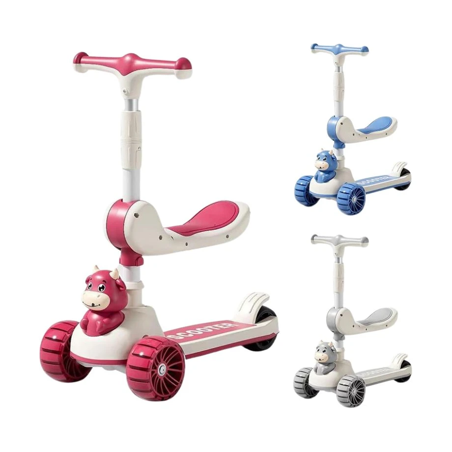 U početnoj fazi, dete može koristiti trotinet sa sedištem kao guralicu, što pomaže u učenju ravnoteže i koordinacije. Kada stekne sigurnost, sedište se lako uklanja i trotinet se pretvara u standardni model za vožnju na tri točka.